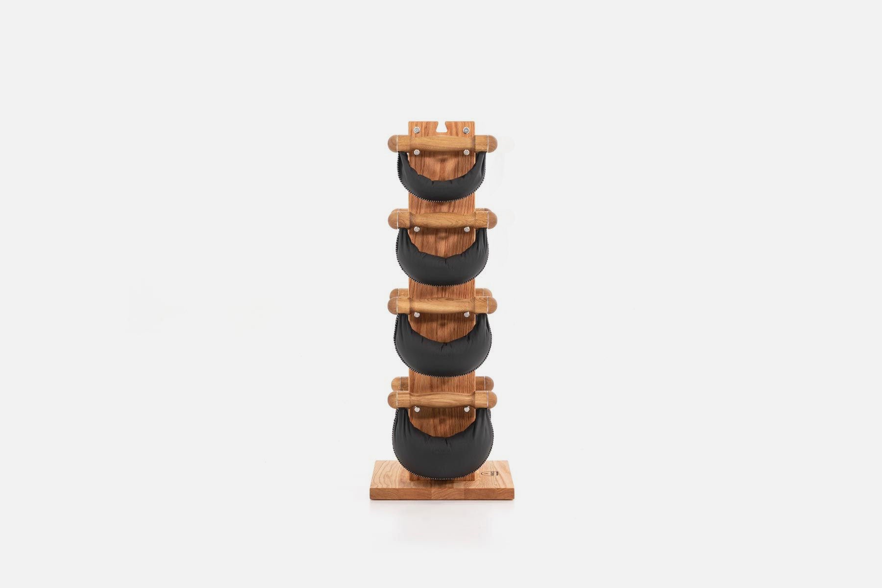 Handles made of solid wood, with hand-stitched genuine leather pouches – eight SwingBells hand weights (2 sets each of 2, 4, 6, 8 kg) are stored compact and upright on the Swing Tower.